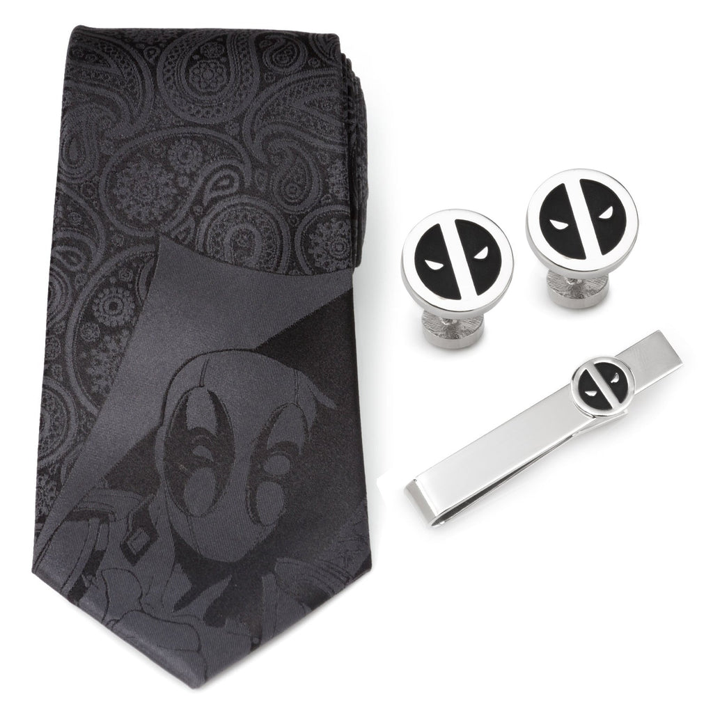 Break the fourth wall with this fun Deadpool gift set. Our Deadpool gifts for him feature a pair of mask logo cufflinks and a matching tie bar, this Deadpool gift set also includes our favorite Deadpool black tie: look closely among the paisley pattern and you'll see a familiar face peeking cheekily out of the bottom. The ultimate gift for the well-dressed fan.