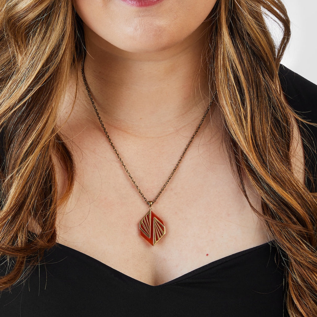 Handcrafted from durable, nickel-free artisan brass with a burnished antique finish, the Alice Necklace brings the groovy essence of its on-screen inspiration into a wearable, retro-chic piece. The pendant showcases an elongated hexagon of bold orangey-red resin, beautifully contrasted by layered, mod-inspired cutout metalwork, capturing the spirit of vintage flair.