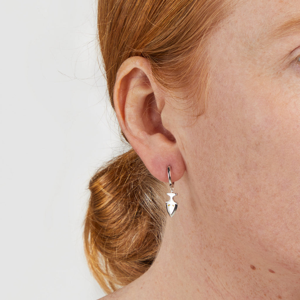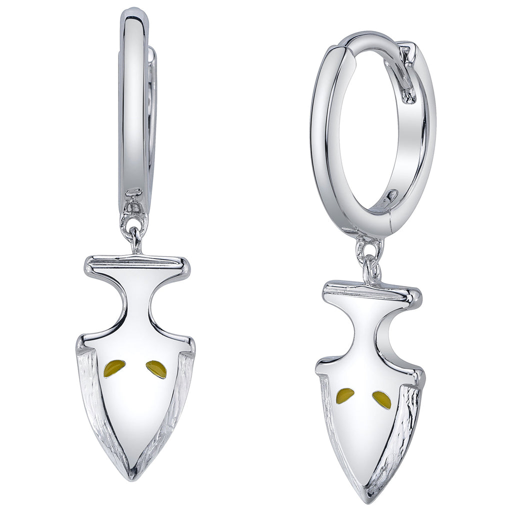 Handcrafted in sterling silver, these earrings capture the essence of the larger prop weapons seen on-screen, translated into a sleek and wearable design. Suspended from stylish sterling silver mini huggie hoop earrings, each dagger features striking yellow enamel Deadpool eye details, adding a pop of color and edge to any ensemble.