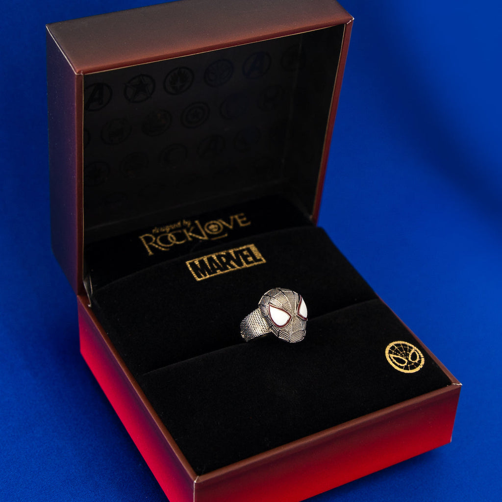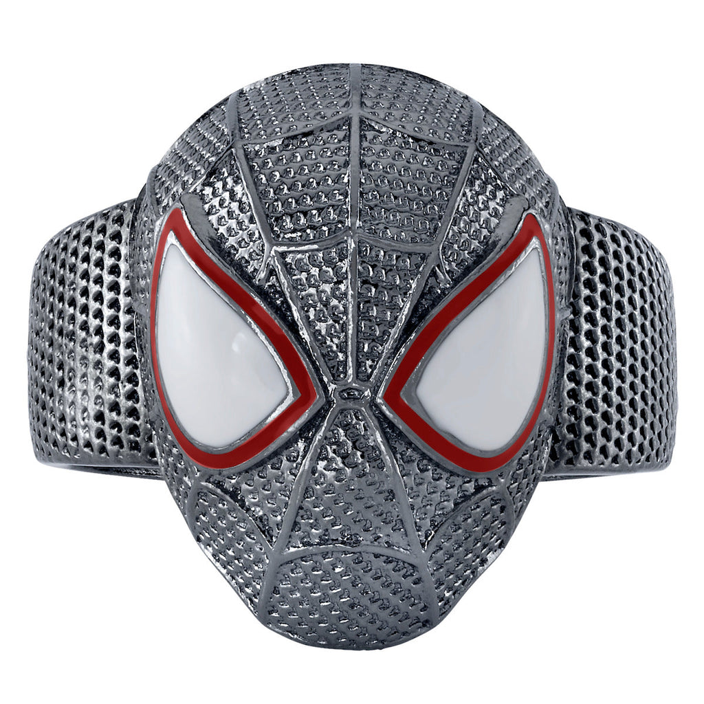 Handcrafted in sterling silver and plated in gleaming black rhodium, this unisex ring depicts the Spider-Man mask of Miles Morales. Reminiscent of his technologically advanced suit made from The Underground’s programmable matter, the ring features pixel-like texture all around the face and ring band, with raised web details. The mask’s eyes are accentuated by dark red and white hand-painted enamel. Sculpted along the ring band in raised lettering: “Miles Morales.” Three-dimensional, the domed mask is hollowed beneath to be lightweight and comfortable for everyday wear.