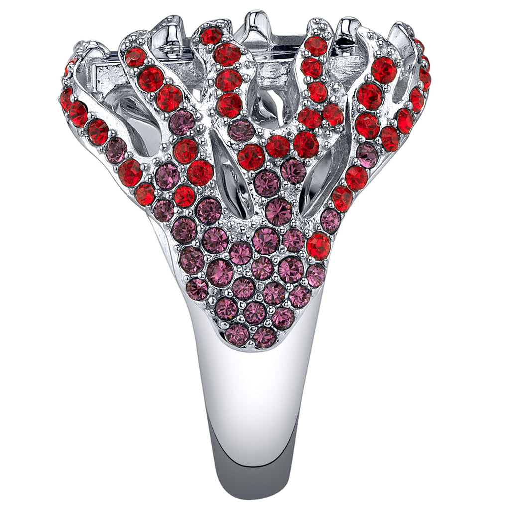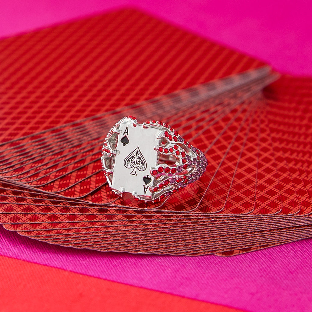Handcrafted in solid nickel-free sterling silver, this statement ring features Gambit’s signature Ace of Spades prominently atop the finger. Intricately detailed with blackened scrollwork, the polished playing card is held in place by flames licking up the sides of the band. Adorned with over 130 pave set cubic zirconia crystals, the ombre design transitions flawlessly from deep purple to fiery red.