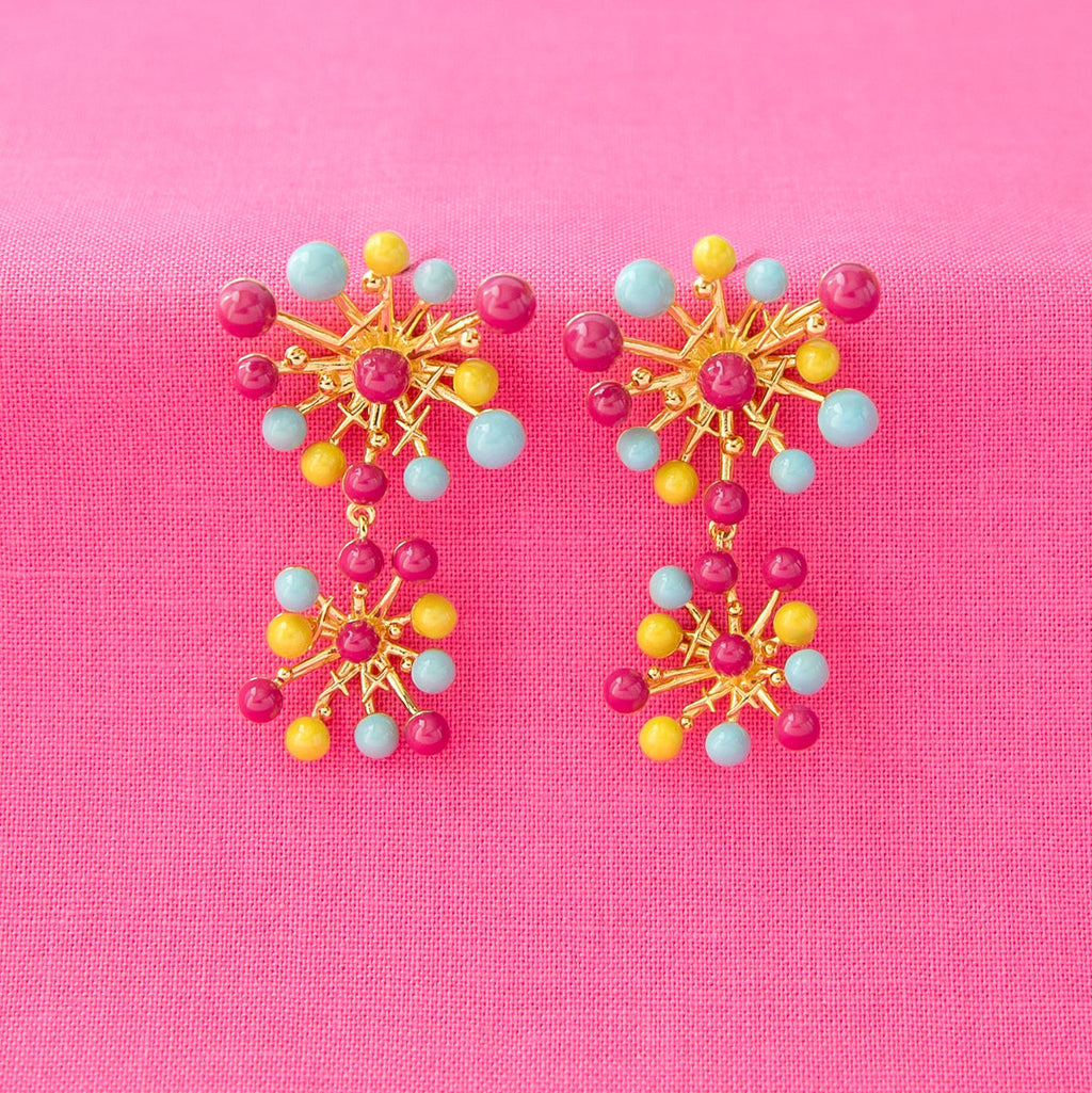 Handcrafted from nickel-free artisan brass and thickly plated in warm 14K yellow gold, these dazzling earrings embody Jubilee's iconic “fireworks” in show-stopping style! Each earring features playful, round enamel spheres that capture her signature pyrotechnic powers, glowing in vivid magenta pink, sunny yellow, and light blue. Sculpted orbs and stars are artfully arranged among the dynamic, three-dimensional burst shape, polished to a brilliant yellow gold finish. The lively design mirrors Jubilee’s energetic spirit, with a larger firework burst at the top and a smaller one dangling below, creating a captivating kinetic display.