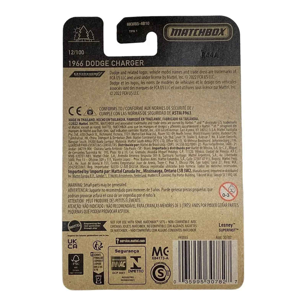 The 1966 Dodge Charger is a standout model that perfectly combines style and performance. As part of the Matchbox 70 Years Series, the Matchbox 1966 Dodge Charger - Matchbox 70 Years Series 12/100 captures the iconic design and essence of this classic muscle car.