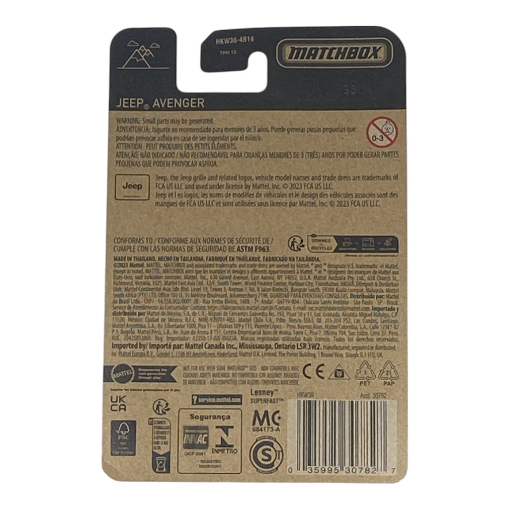 With its sturdy build, the Matchbox Jeep Avenger is perfect for kids who love to explore rugged terrains and steep hills. Its vibrant color and realistic features make it stand out, not just in your collection but also in playtime with friends. The Matchbox Jeep Avenger is more than just a toy; it's a gateway to a world of imagination and adventure!