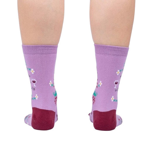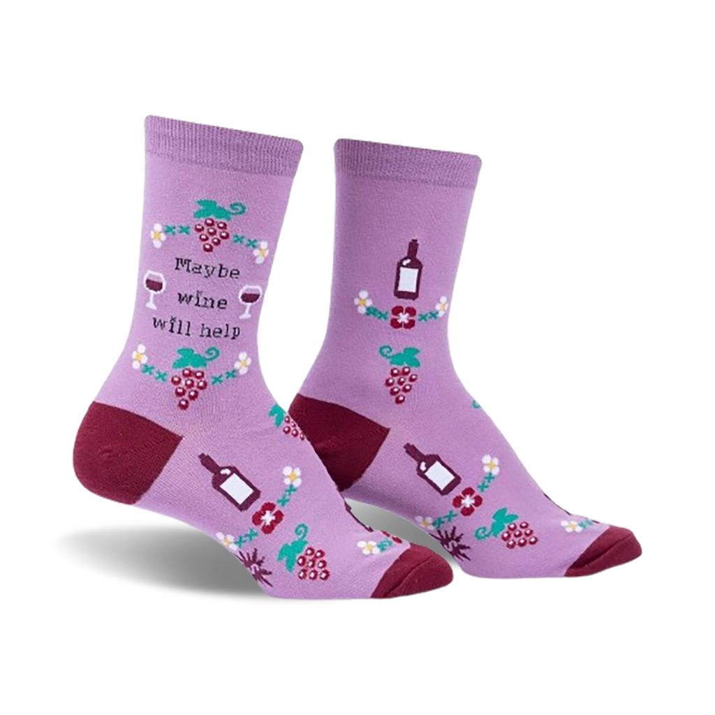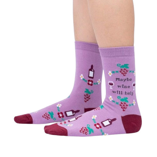 Wine not wear these purple Maybe Wine Will Help crew socks for women? The pattern of wine bottles, grapes, and flowers, along with the text "Maybe Wine Will Help" will surely make you smile. They're the perfect pick-me-up for a long day or a fun night out. Who knows, maybe wine will help!