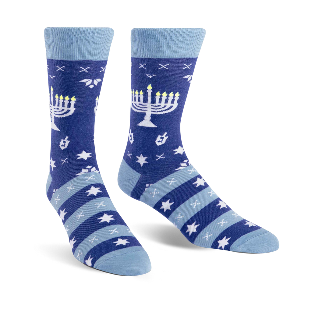 When the world gives you Hanukkah, make some latkes with these mazel toes! We've tossed tradition out the window, and these socks simultaneously celebrate the holidays and remind you to let the menorah-go! With a bold blue background and festive patterns of menorahs and snowflakes, these crew socks are ready to be the star of your holiday get-together or your regular Tuesday - because who says we can't celebrate Hanukkah all year long?