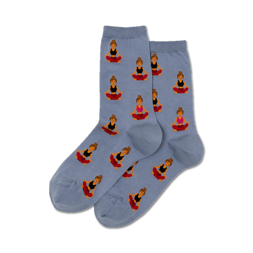 Slip into a pair of these blue crew socks and channel your inner yogi. Featuring a vibrant pattern of dark-haired, dark-skinned, meditating women in red pants and pink tops, these comfy socks remind you that even in the craziest of poses, staying calm and centered is key.