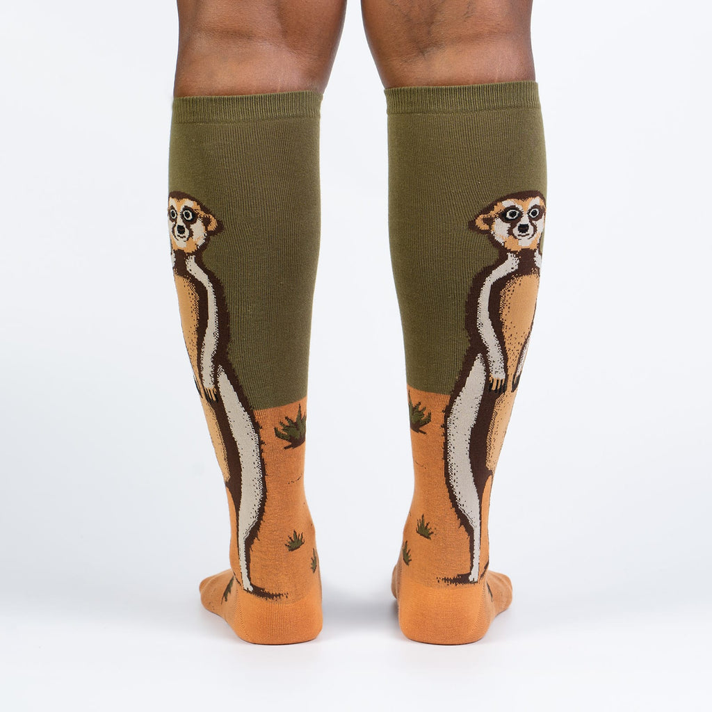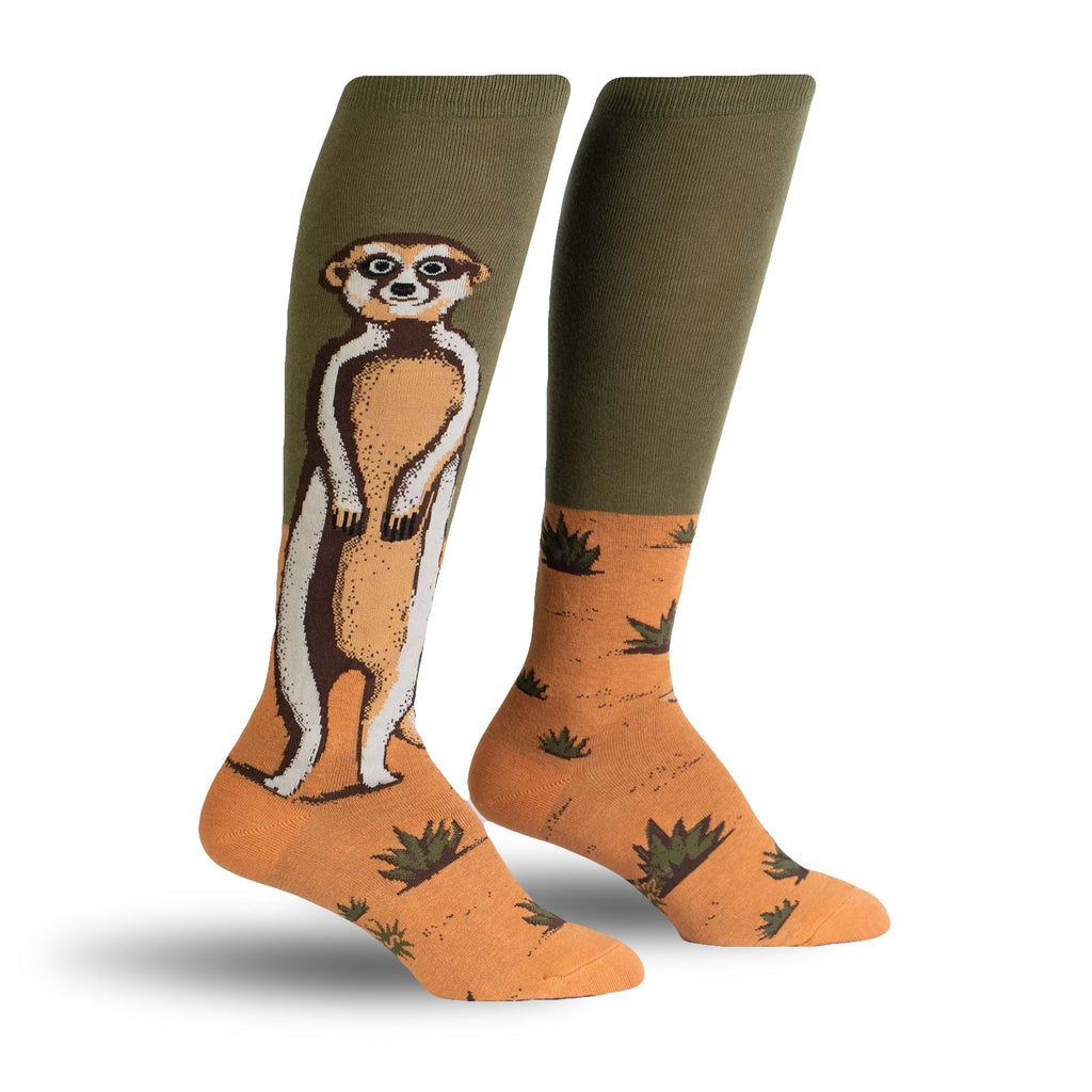 These knee-high socks feature a meerkat standing tall against an orange-and-green background. The visible portion shows a striking illustration of the meerkat, detailed with various shades of brown and white. The olive-green section of the sock transitions to a sandy orange at the bottom, with a small, repeated pattern of green plants. They're comfortable, fun, and guaranteed to add a dash of unexpected whimsy to your day.