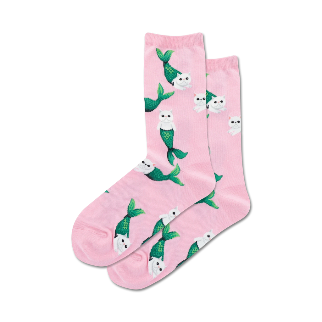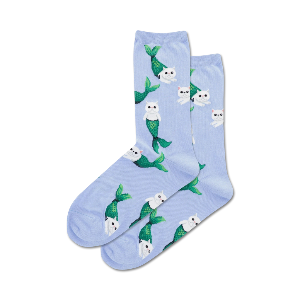 Calling all cat lovers and mermaid enthusiasts! Dive into the magical world of Mermaid Cat socks. These light blue crew socks feature an adorable pattern of white cats with green mermaid tails - perfect for adding a touch of whimsy to your everyday style. Show off your love for these enchanting creatures and embrace your inner mermaid cat with every step you take.