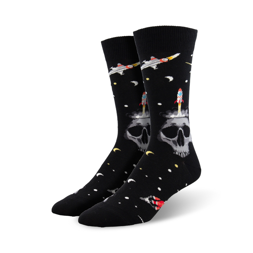 Prepare for liftoff! These astronomical socks, part of our "Mind Blown Collection," are a total blast! Featuring rockets erupting from the heads of space-faring skulls, they are the ultimate fashion gear for astronauts, earthlings, and martians alike. With stars, planets, and spaceships decorating the black background, these stellar crew socks are a stellar choice for your next trip around the universe.