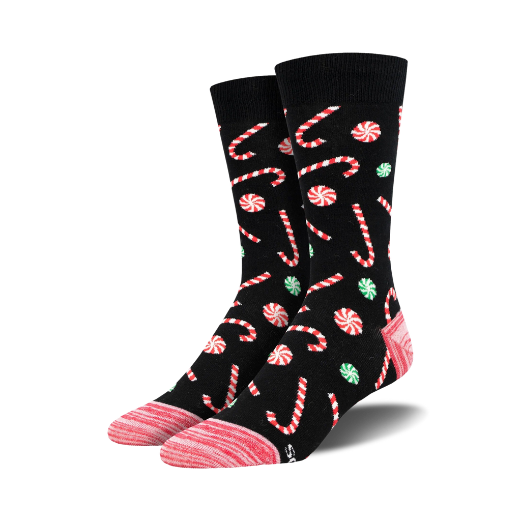 Treat your feet with the Christmassy-delicious-ness of the Minty Fresh Christmas Crew Socks! With a candy cane pattern in red, white and green on a black sock, and topped with a pink rim, these unisex crew socks are a sweet treat for your feet this holiday season. These candy canes are so realistic, even Santa will ask you where you got them!