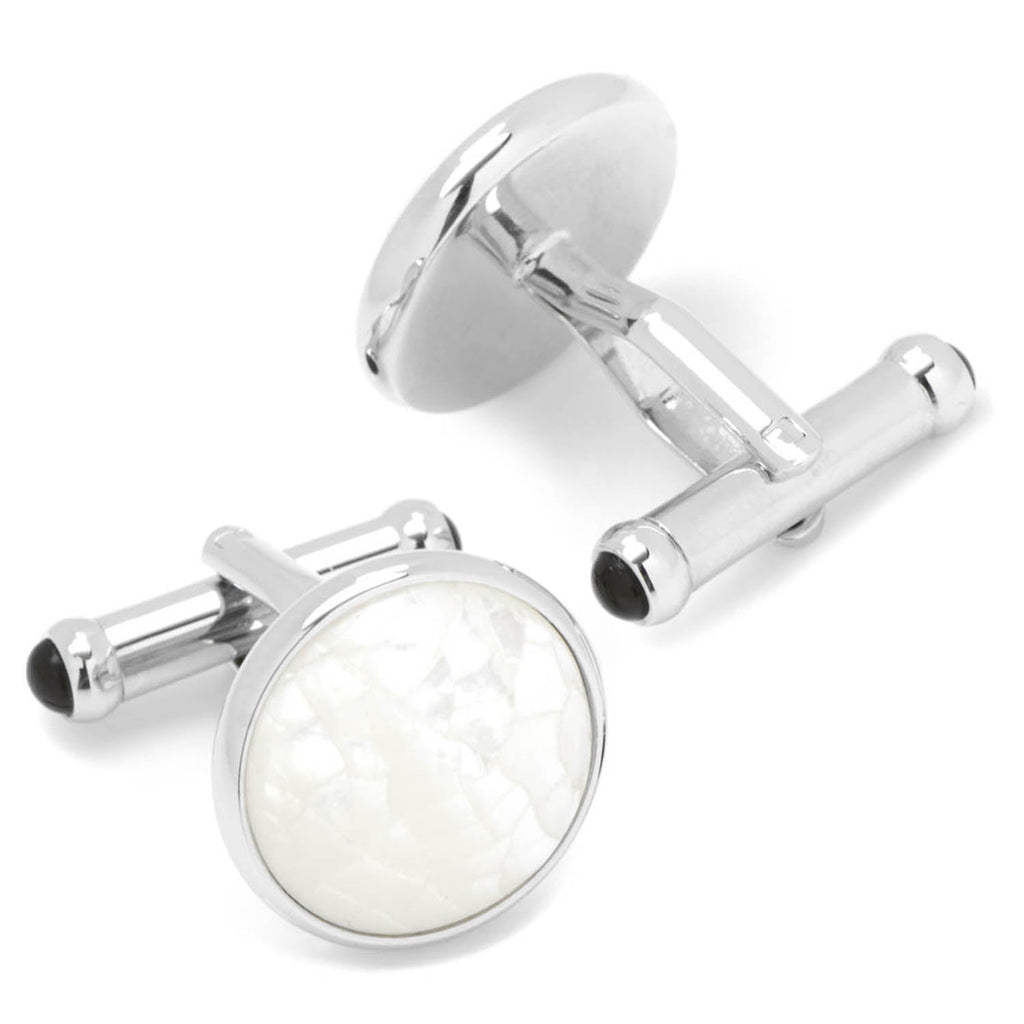 Bring the elegance and simplicity of Mother of Pearl to your wardrobe with this set of white cufflinks and tuxedo studs. Featuring two different effects for a twist on an old favorite, the cufflinks use a cracked mosaic finish and the studs have been left smooth and pearly. Includes individual gift box.
