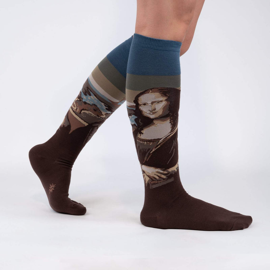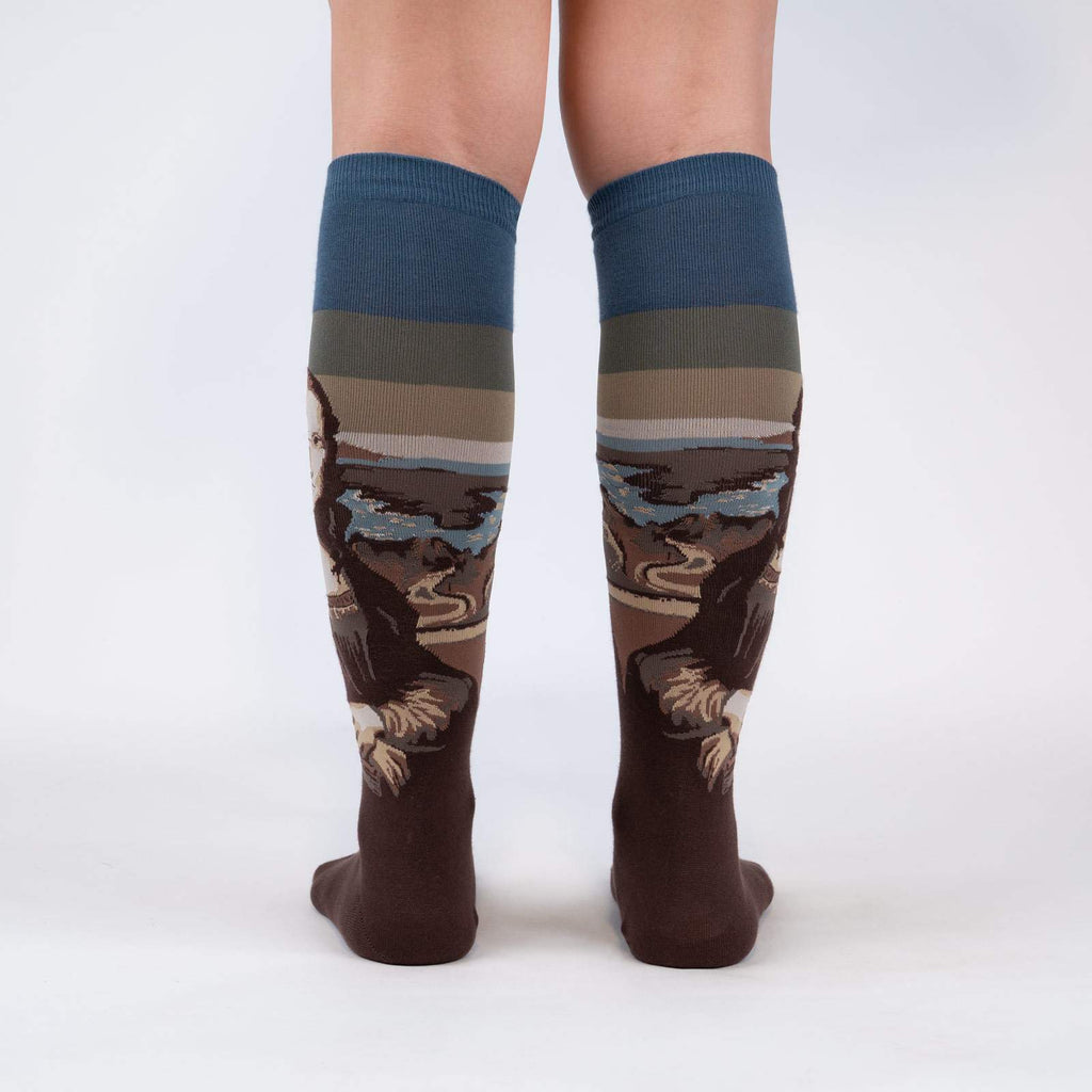 These knee-high socks feature a pretty cool Mona Lisa design. The main color is a dark brown, with a portion of the famous painting displayed prominently. Above the image, there's a horizontal stripe in muted greens and blues. The socks shown are comfortable-looking and have a slightly textured knit. They're perfect for adding a touch of art to your everyday outfit, or for secretly admiring Leonardo's masterpiece throughout the day.