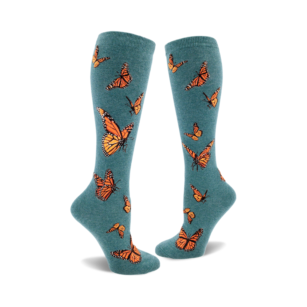 Brighten up your day and let your style take flight with our Monarch Butterfly knee-high socks! Flaunting a sassy teal blue hue speckled with vibrant orange monarch butterflies, these socks are perfect for adding a pop of color and a touch of whimsy to any outfit. Whether you're lounging at home, strutting in the office, or stepping out for a fun event, these socks are your new go-to for making an unforgettable statement. Why settle for boring when you can bring your wardrobe to life with a flutter of style? Grab a pair today and show off those true colors!