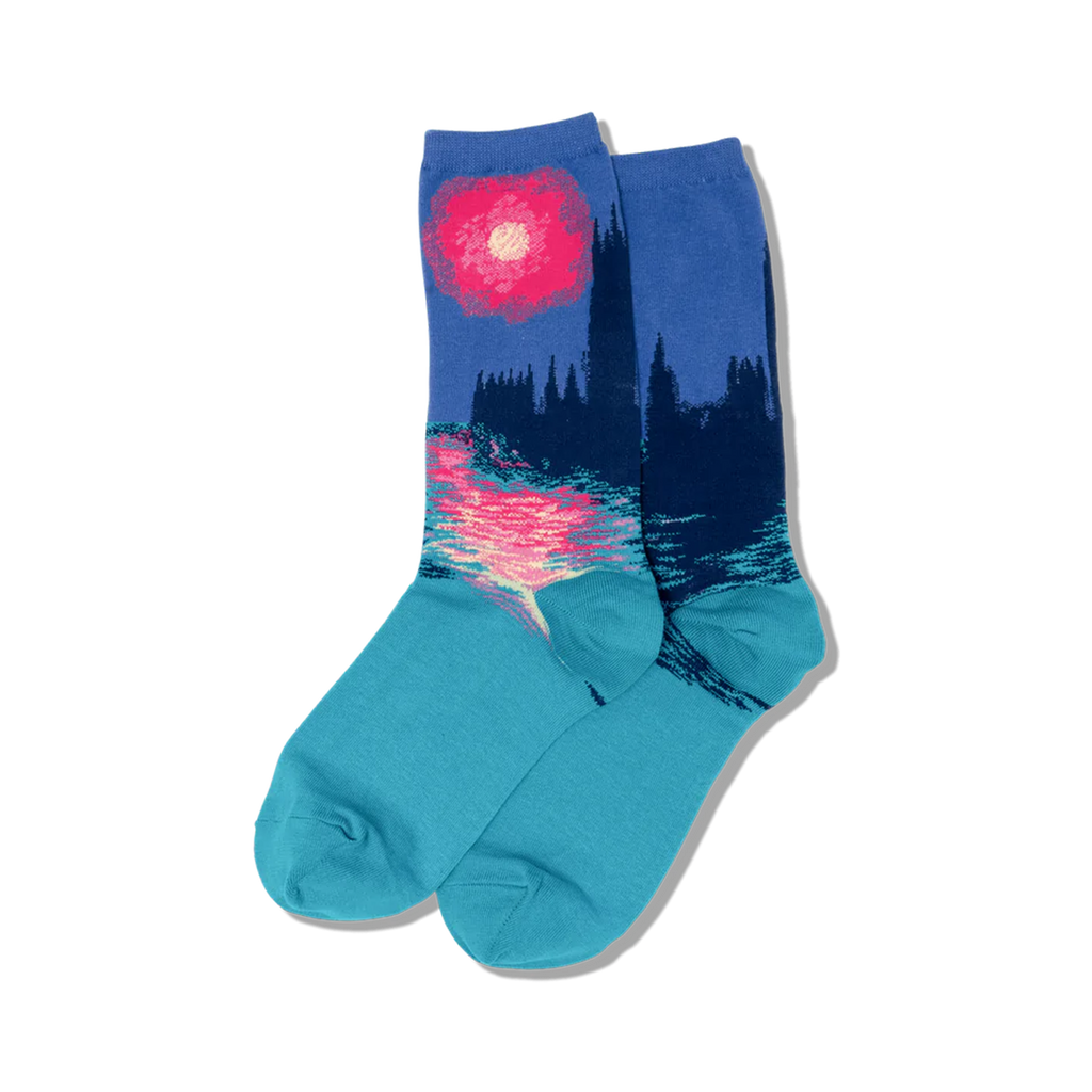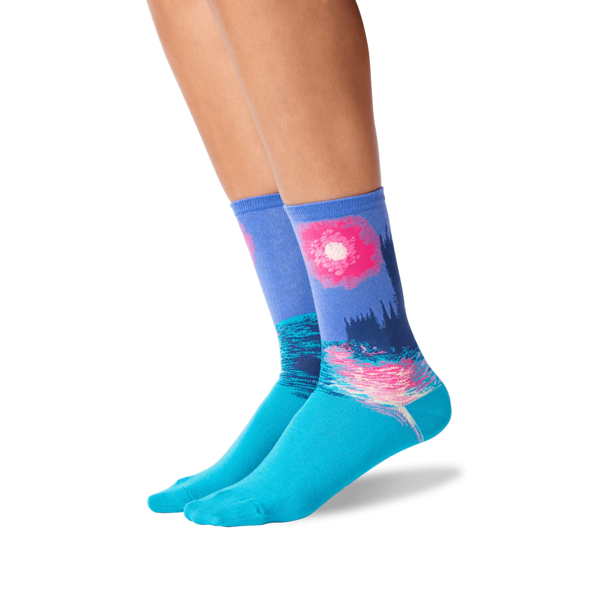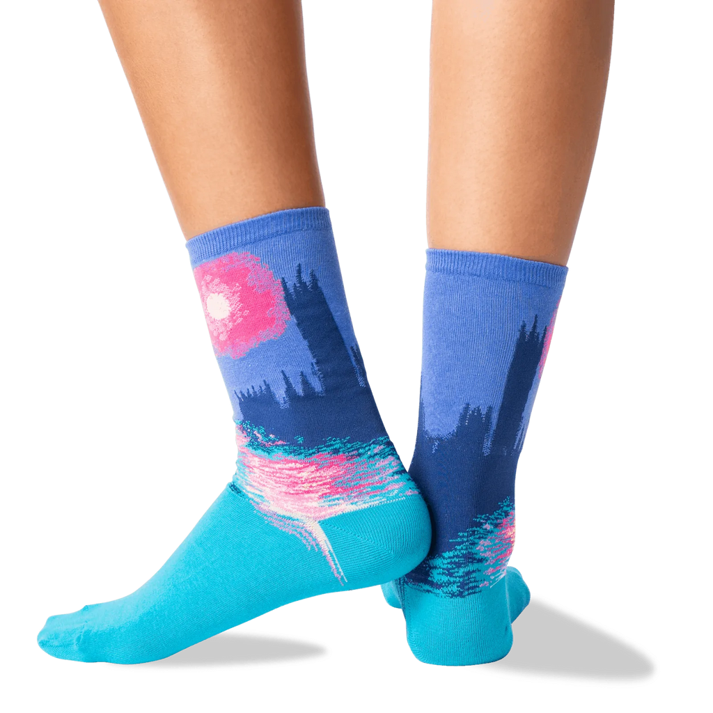 Step into a masterpiece with our Monet's Houses of Parliament at Sunset socks! These socks feature the iconic Houses of Parliament in London, painted by the legendary Claude Monet himself. With its blend of pink, blue, and orange, these socks are a vibrant celebration of art and beauty. Plus, they're comfy enough to wear while you tackle your own artistic pursuits. Take a walk down an art gallery or stroll along the Thames, in artistic style!