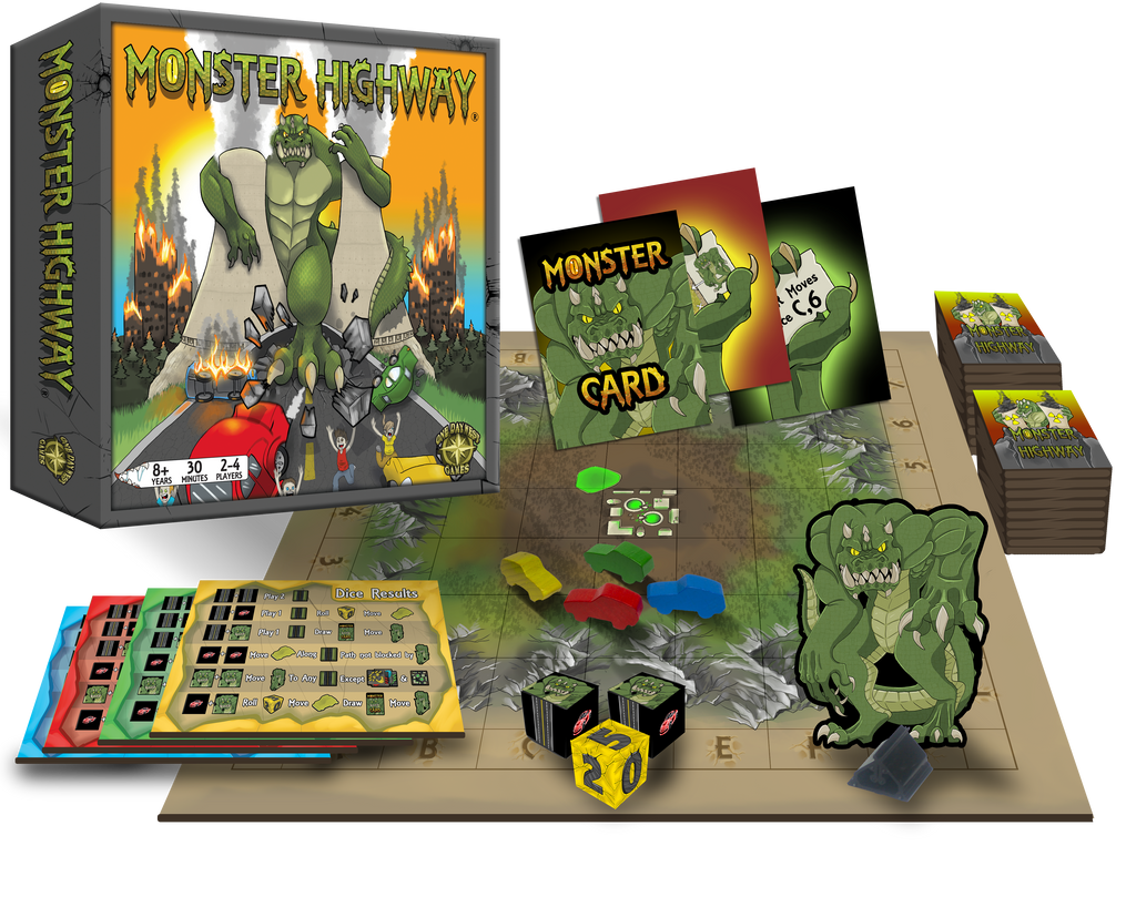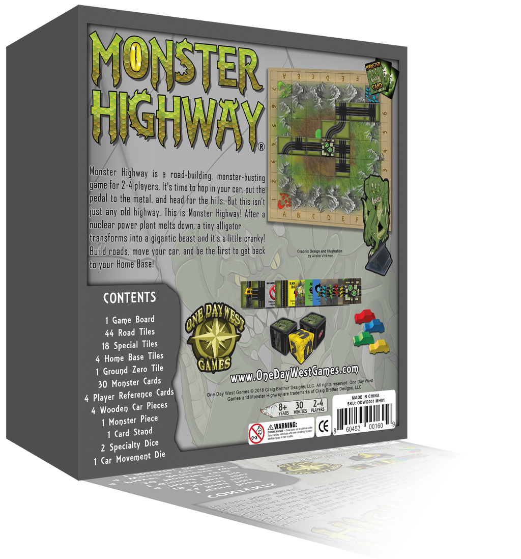 Monster Highway is an award winning board game where 2-4 players are building roadways using tiles to get to your Home Base. After a nuclear meltdown at a power plant, the lake next to it was quickly saturated with radioactivity. An alligator in the lake transforms into a road smashing, car crushing monster. Be the first to build your roadway and drive your car from ground zero to your home base to win the game. Beware of the monster and of your opponents. No one is safe on Monster Highway!