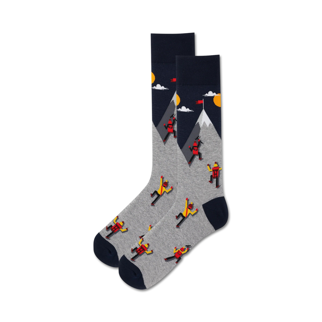 Get ready to ascend the fashion summit with our Mountain Climbers socks! These gray crew socks feature red and yellow adventurers scaling a blue mountain, reminding you that even the toughest peaks can be conquered with determination and style. Reach new heights in comfort and fun - socks made for men who love to explore.