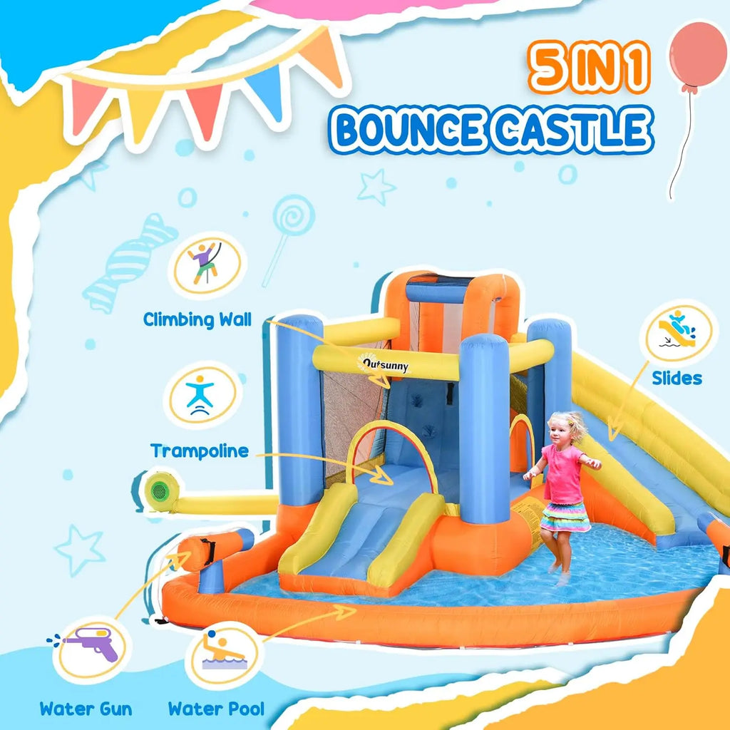 🏰 5-in-1 Design – Includes a slide, water pool, climbing wall, water cannon, and trampoline for maximum fun and variety of activities.
