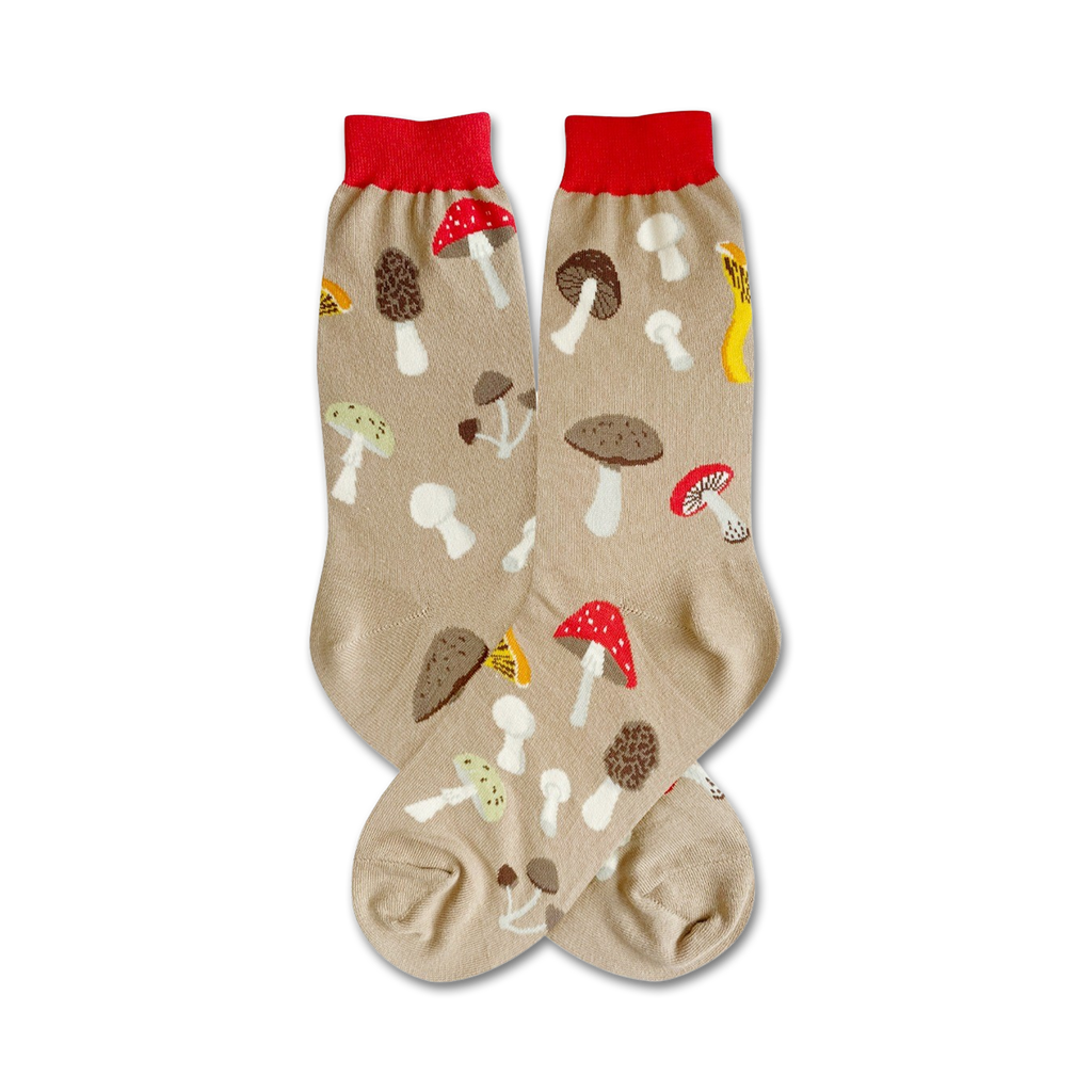 Step into a world of whimsy and wonder with our Mushroom Fungi Crew Socks designed for women! With their light tan base and vibrant all-over mushroom pattern in shades of brown, red, yellow, and white, these socks will have you feeling earthy and fabulous. Whether you're a nature lover or just love quirky fashion, don't miss out on these fun and fashionable footwear.