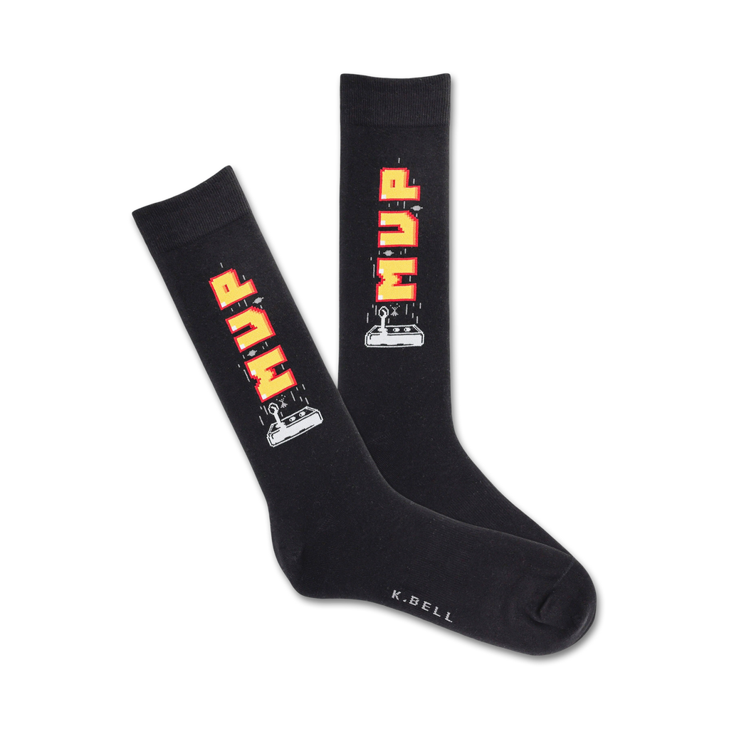 MVP Crew Socks: Get ready to dominate the fashion game with these crew socks featuring pixelated images of a vintage video game controller! These black crew socks with bright yellow and red accents scream "victory" in the funniest way possible. Inspired by the most epic retro video games, these socks will add a touch of nostalgia and joy to your feet. Perfect for the gamers, memers, or anyone who loves a bit of retro fun, these socks are sure to be the MVP of your sock collection.