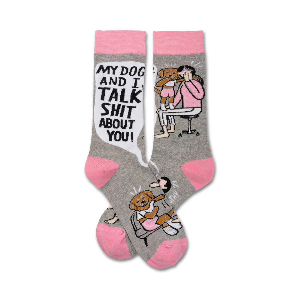 Barkin' up the right alley with these dog-gone good socks! Picture this: a sassy pup and its human bestie, dishing out the dirt on you while you strut your stuff. The vibrant cartoon design on these gray socks, featuring pink toes and heels, will have everyone cracking up. The words "My Dog And I Talk Shit About You" leave no doubt about who's got your back (or should we say, paws). Get ready to unleash the laughter and show off your fur-bulous bond today!