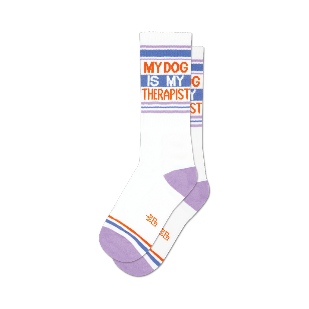 These socks scream louder than your bark-happy beagle at the door! Adorned with "MY DOG IS MY THERAPIST" on pristine white accented with vibrant purple and playful orange stripes, they're perfect for lounging, dog park jaunts, or just showing off your paw-some style at the next pet parents' meet-up. Feel the fuzzy warmth of your furry friend, even on your feet. Why wear boring socks when you can celebrate your true soulmate? Grab a pair, flaunt your paw pride, and spark conversations with fellow dog lovers!