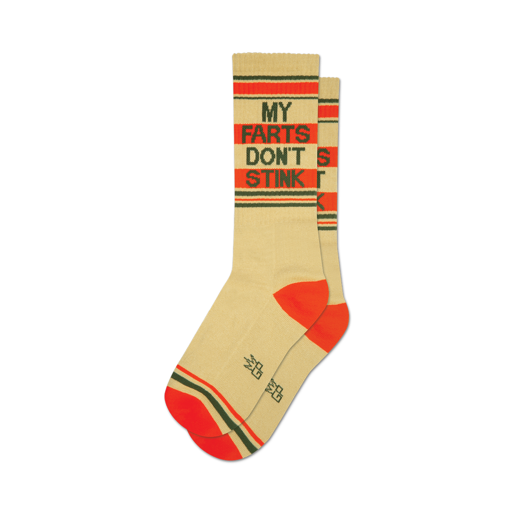 Meet the socks that are as smooth as your poker face and as subtle as your weekend brunch order: cream-colored charmers with red and green stripes. They boast a declaration in brown and green—'My Farts Don't Stink'—because sometimes, it’s only fair to warn the world about your brand of silent but delightful. Perfect for those who believe in truth in advertising, right down to their toes.