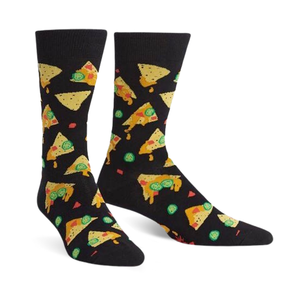 Nacho, Nacho Man - Yeah, yeah, yeah! Who says socks can't be extravagant and fun? For those with a taste for the extreme, we give you the Nacho, Nacho Man crew socks. Nachos aren't just for eating anymore! Picture this: a black sock that shows a unified front of nachos with yellow and red triangles and green circles. And they're topped with a red border, because...why not? Sock on!