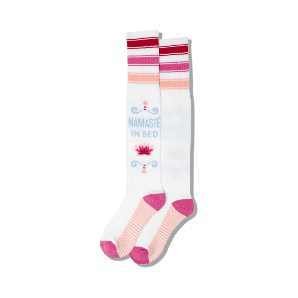 Namaste is more than just a Sanskirt word that means hello and goodbye. It is a way to pay respect and homage too. Each cool pair of women's knee high novelty socks feature the word "Namaste in Bed" printed on the sides. There is a beautiful lotus displayed beneath the words against a white background. Gift these awesome socks to your favorite yoga instructor or the yoga lover in your life.