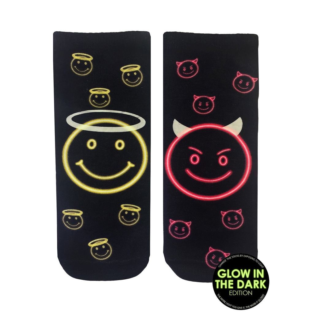 These 'Naughty or Nice? Glow' socks are a fun twist on the classic angel-devil theme. They're black crew socks with a visible glow-in-the-dark design. One sock features a neon yellow smiley face with a halo, while the other shows a mischievous neon pink devil face with horns. Smaller, matching faces are scattered across both socks. The visible portions show a fun, casual style perfect for adding a bit of quirky personality to your outfit. They're comfy and will brighten up any day or night.