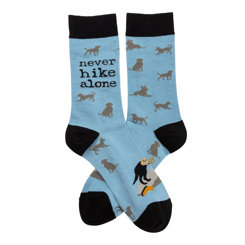 These 'Never Hike Alone' socks are a light blue with a repeating pattern of gray dogs in various poses. The phrase 'never hike alone' is visible on one sock, in a simple black font. A small image of a person with a dog is shown near the bottom of one sock. The socks have black cuffs. They're comfy, fun, and perfect for any dog lover who likes to hit the trails.