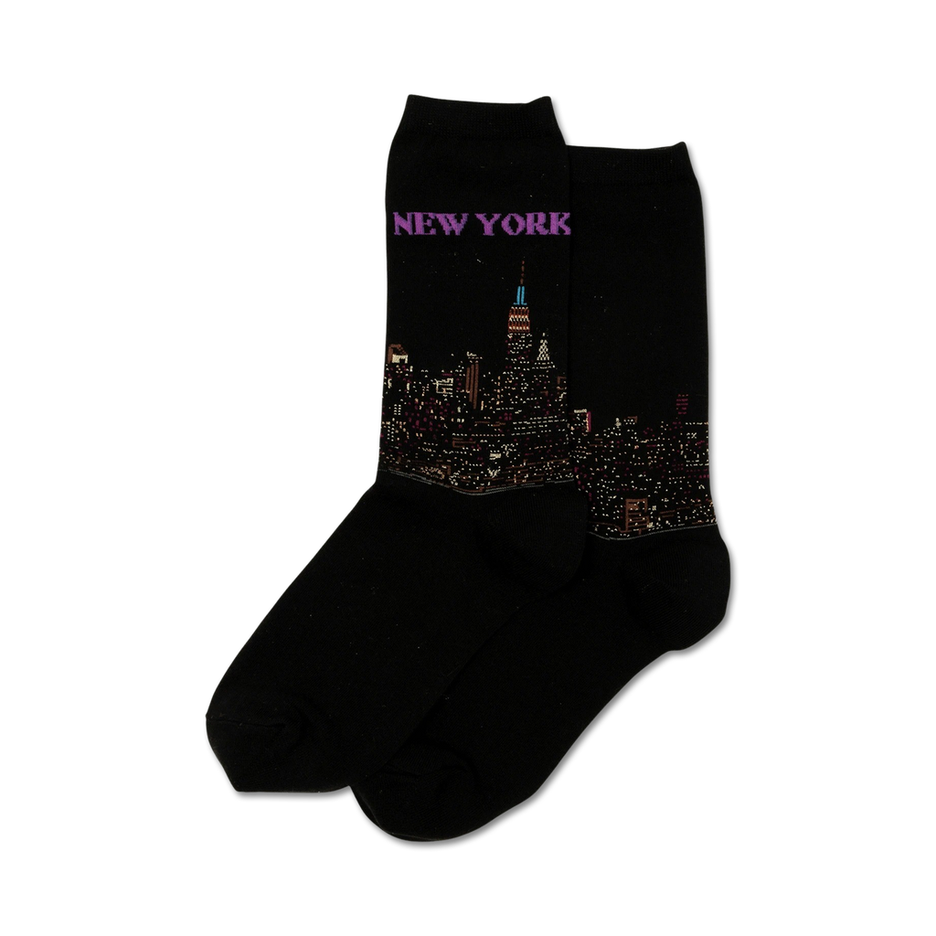 Black New York City skyline socks. These women's crew socks feature a vibrant pattern of the iconic New York skyline. The bright colors and bold design create a fun and stylish look that's perfect for any New York fan. From the Empire State Building to the Statue of Liberty, these socks have it all. You'll feel like you're walking through the streets of the Big Apple every time you put them on. Socks have reinforced toes and heels for added durability and a comfortable fit.