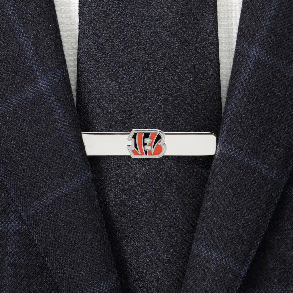 From first downs to touchdowns, sport this Cincinnati Bengals tie clip to score big fashion points and support your favorite NFL team. The official team logo is detailed in enamel on a silver tone metal setting, offering you a unique way to show your team spirit. Features a hinge back closure. Pair with our Cincinnati Bengals Cufflinks or Lapel Pin to complete your look.