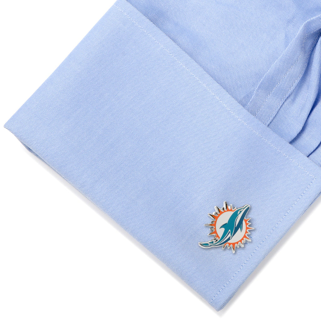 From first downs to touchdowns, sport the Miami Dolphins Cufflinks on your cuffs to score big fashion points and support your favorite NFL team. The official team logo is detailed in enamel on a silver tone metal setting, offering you a unique way to show your team spirit. Let your devotion to the Miami Dolphins infiltrate your wardrobe in the most dapper way. Officially licensed by the NFL.