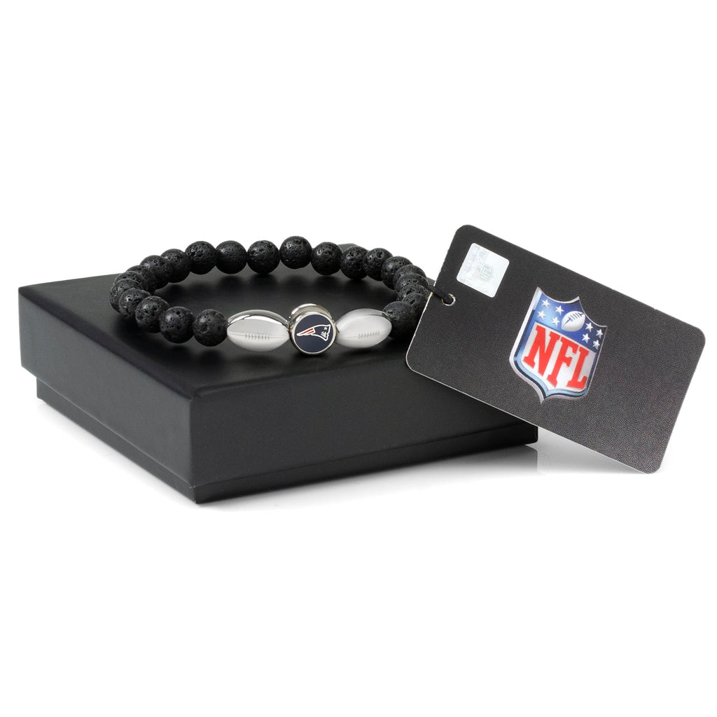 A contemporary accessory for the modern NFL fan, this stylish bracelet featuring the New England Patriots logo is the new way to show your fan loyalty. A series of smooth and shiny lava rock beads are accented by a stainless steel and enamel logo bead, which has been framed by two miniature footballs. Perfectly weighted and built to last. Stretched elastic interior to fit most wrists. Officially licensed NFL beaded bracelet.