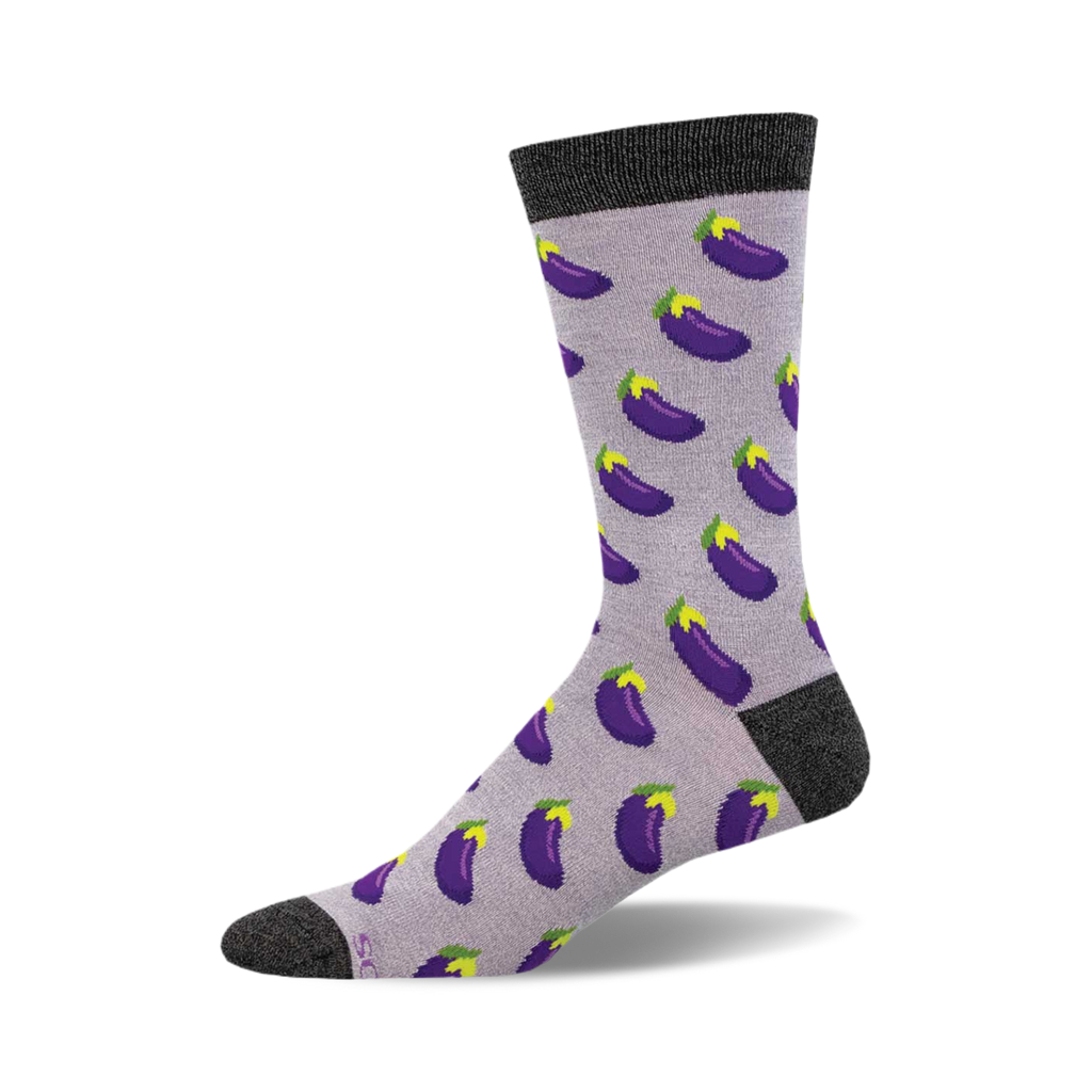 Unveil your quirky side with Nightshade Bamboo socks! Featuring a playful swarm of purple eggplants dotted across a chic gray canvas, these socks are anything but ordinary. With vibrant yellow stems and lush green leaves, your feet will steal the show wherever you go. Perfect for garden parties, casual Fridays, or just lounging around, they promise to keep the conversations as lively as their pattern. Why be mundane when you can be fabulously fun? Grab a pair and flaunt those funky feet!