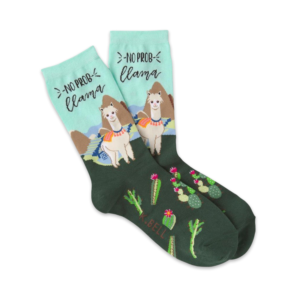 Who says socks can't be fun? These No Probllama socks take the cake with their llama-zing design. Featuring a chilled-out llama bundled in a blanket, these crew socks have cactus friends and 'No Prob Llama' written on them. They're the perfect pick-me-up for women who need a reminder to kick back and relax. Guaranteed to llama-nize your day!