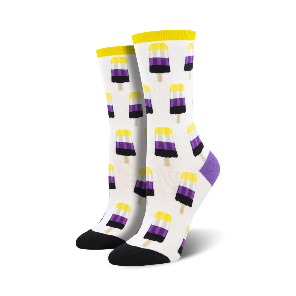 Calling all popsicle lovers and non-binary pride supporters! These Non-Binary Pops socks are serving up a refreshing reminder that even the subtlest hues can pop. With their vibrant purple, black, and yellow popsicles dancing across shimmering white socks and a sweet purple toe, heel, and cuff combo, these crew-length wonders will have you feeling fruitylicious from your feet up. And when you catch a glimpse of those toes poking out from your kicks, you'll be chanting in unison: "LGBT-Popsicles, we're proud, we're queer, we wear our colors loud and clear!"
