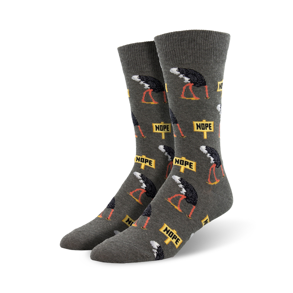 Who says ostriches hide their heads in the sand to avoid danger? These funny green socks declare the futility of hiding from the world with a big black and white ostrich and the word NOPE! . We don't know why ostriches stick their heads in the sand, but we do know these ostrich socks will bring a smile to everyone's face.