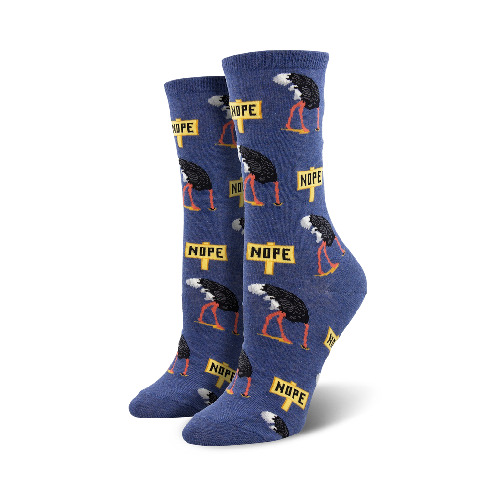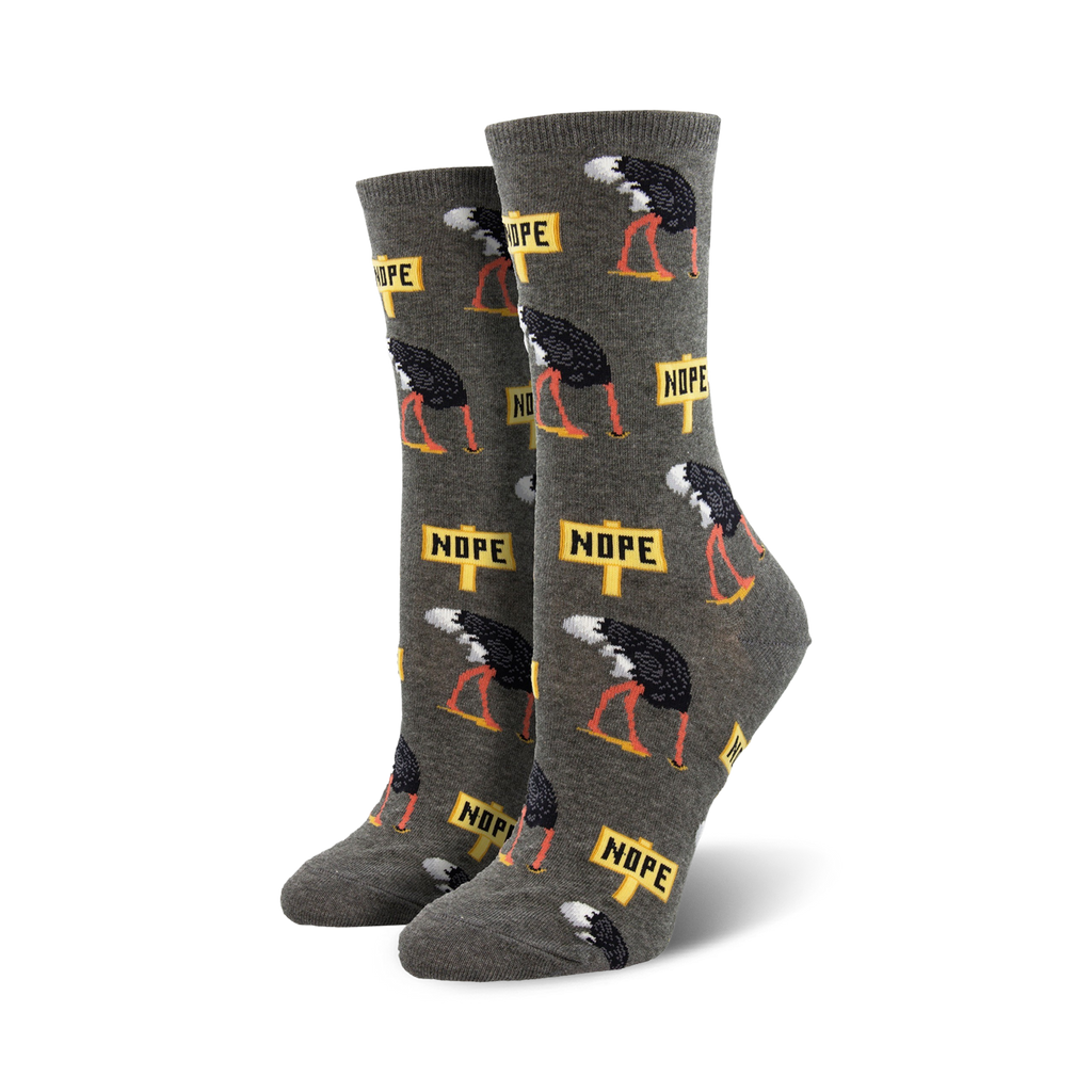 Meet "Nope" the ostrich, the new crew length sock designed for women that'll bury its head in sand instead of your feet. With a striking pattern of black ostriches in yellow sand, these socks have "NOPE" signs posted all over. Fun socks will keep reminding you to put your best foot forward, even when life tries to bury your head!