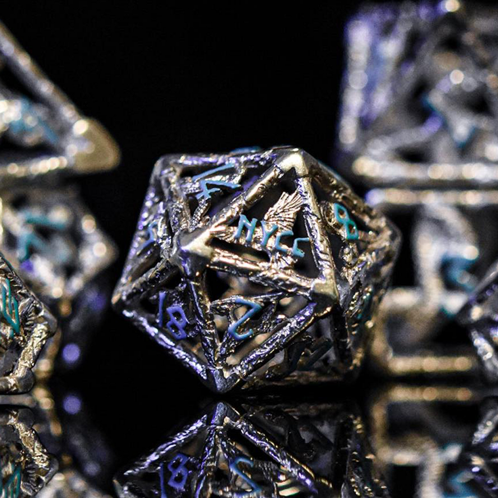 Get rolling with this striking silver dice set! Made for New York City Comic Con, these dice feature NYCC on the D20. Our own Misty Mountain Gaming dice design team crafted unique, detailed patterns of ravens, wolves, and snakes - a thrilling addition to your collection!