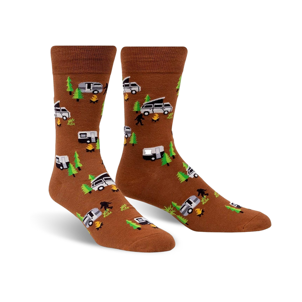 Slip into these On The Road Again novelty socks, featuring a pattern of brown camper vans, green trees, and black Bigfoot, and embark on an adventure with every step. Take your feet camping through nature and let Bigfoot guide your journey.