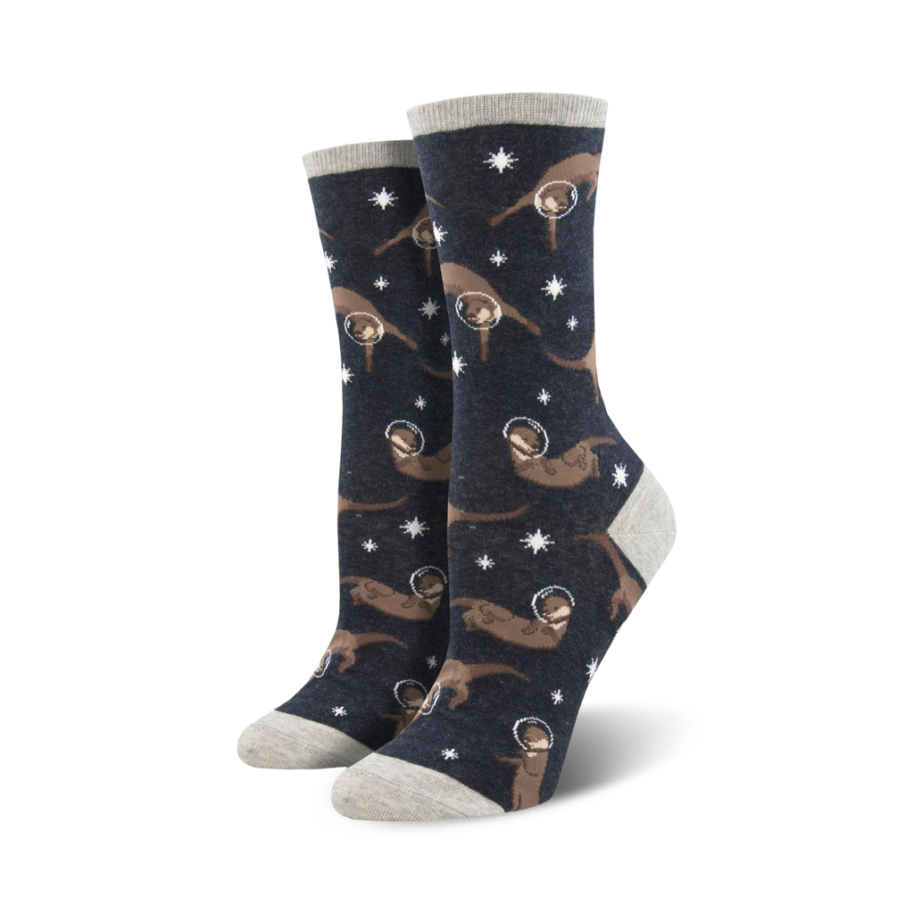 Otter Space socks: Ready for lift off. These cosmically cute socks feature a cartoony crew of space-faring otters. The bright blue background is sprinkled with stars, planets and galaxies. All aboard! These socks will make paws-itively stellar stocking stuffers and are the purr-fect gift for women who love space and otters. They're out of this world!