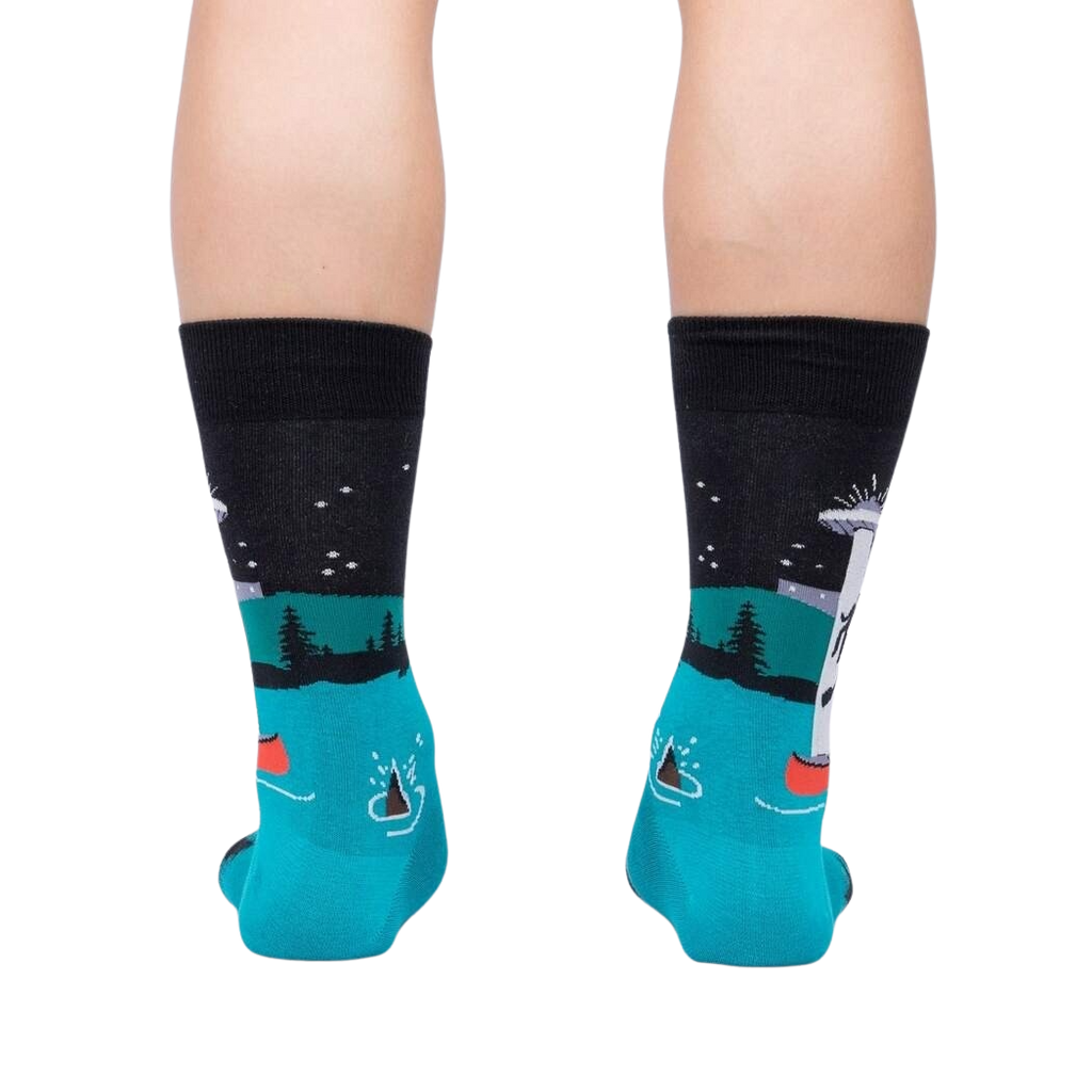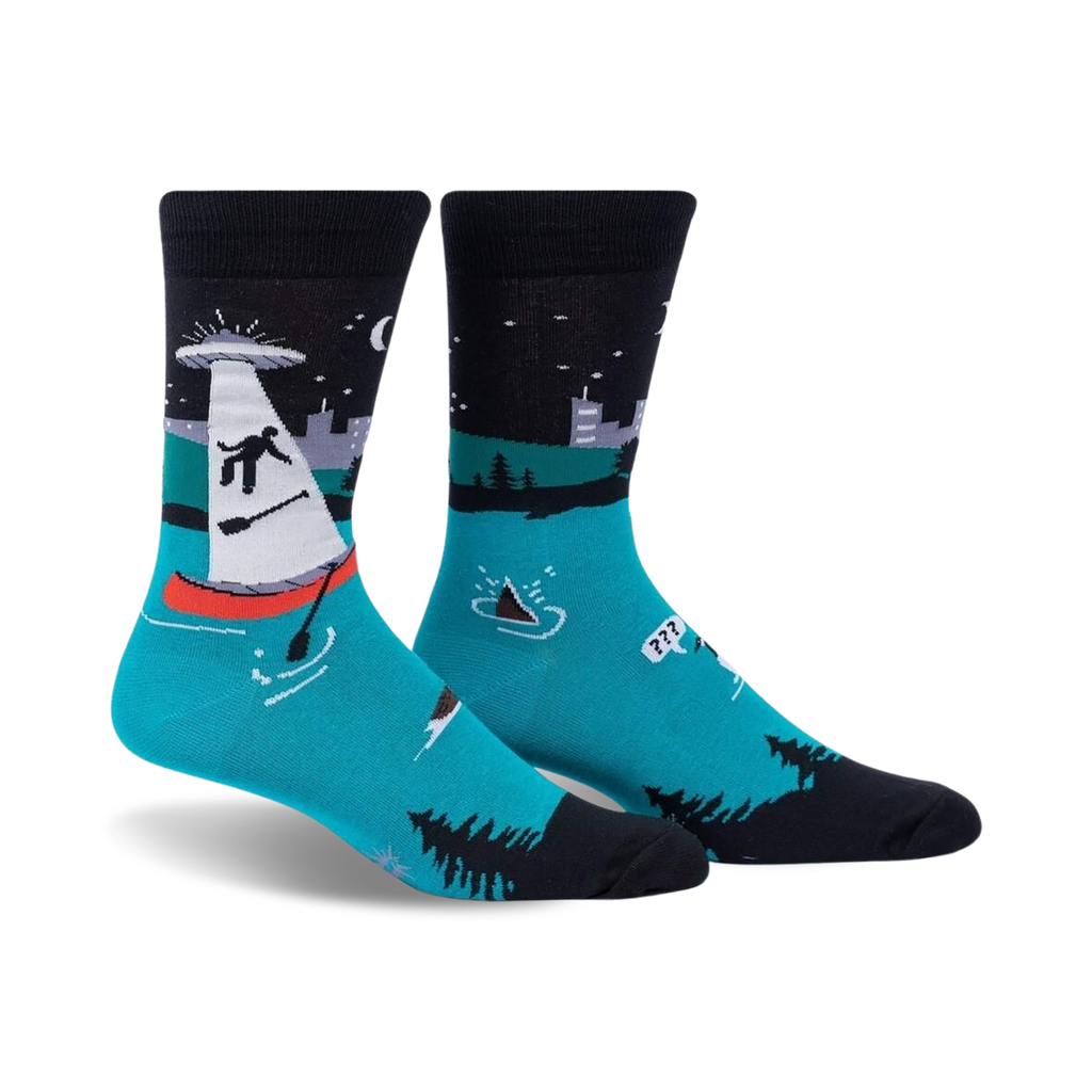 Buckle up for an Out of Boaty Experience with these exhilarating socks! Picture this: a groovy blue canvas adorned with a person on a boat, abducted by curious aliens in a sleek spaceship. Their legs flail, adding a touch of hilarious drama. Embrace the unknown and let these socks abduct your style to infinity and beyond.