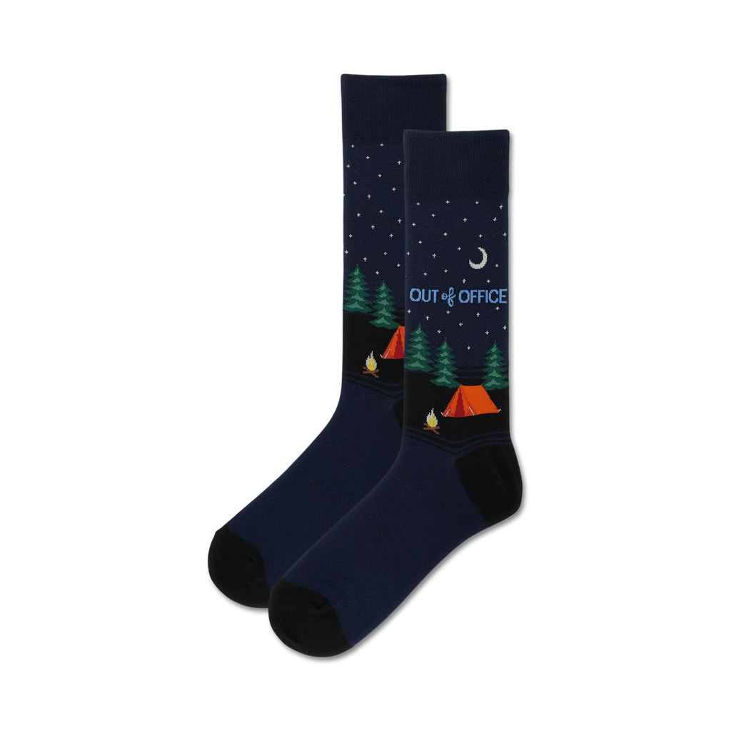 Step up your sock game with these wild camping crew socks. This deep blue pair is covered in glowing white stars, towering green pine trees, a cozy orange tent, and a warm campfire. To top it all off, the words "Out Of Office" remind you to kick back and enjoy the wilderness. Whether you're hiking through the mountains or just kicking back on the couch, these socks will bring a smile to your face.