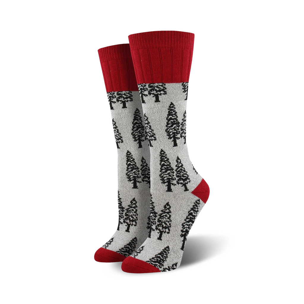 Outlandish Trees: These boot socks are ready to trek through the forest of your day, covered in a pattern of black pine trees against a gray background. With a solid red top, these socks scream outdoor adventure and will add a touch of whimsy to your hike or camping trip.