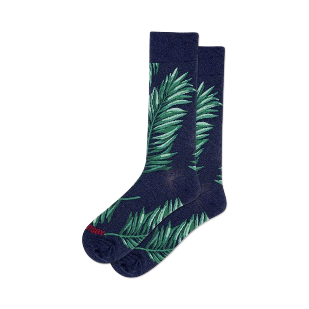 You know how palm trees sway in the breeze, bringing to mind images of sandy beaches and crystal-clear waters? Well, say hello to the Palm Leaf socks your new favorite accessory to transport you to paradise! These bad boys are made for adventurous souls who appreciate the finer things in life, like a good time and feeling comfy from head to toe! Let your feet soak up that tropical island vibe in these crew-length socks, featuring an all-over pattern of green palm leaves on a dark blue background. So go ahead, take a walk on the wild side and let these socks turn your ordinary steps into a vacation-like strut!