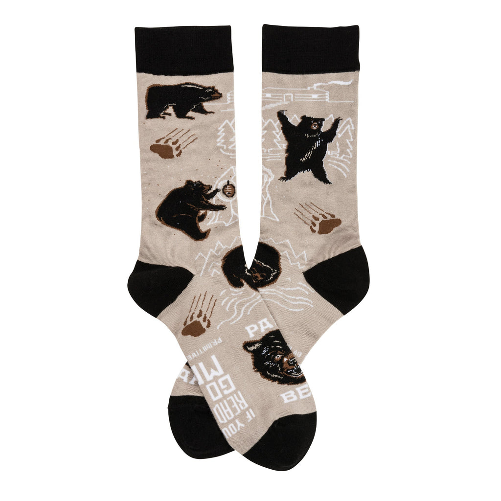 Meet the Papa Bear socks. They're beige with a fun pattern of black bears- some strolling, some leaping. There are also paw prints and what looks like a simplified mountain range design. The visible text says something about bears and going somewhere. The cuffs are black. These are crew socks; the full length isn't shown in the image. They're pretty darn cute.