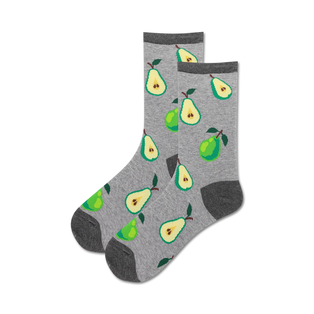 Say hello to the juiciest socks in town! Our Pear Crew socks are as sweet and juicy as the fruit itself. Picture this: a bunch of happy yellow pears, each with a cute little green leaf and a brown stem, dancing across your feet. And to top it all off, these bad boys have pink toes, heels, and cuffs. They're like a fruit salad for your feet!