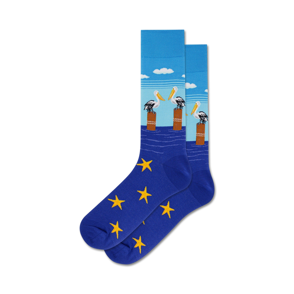 Pelicans on Posts Socks: Make a splash with these vibrant crew socks featuring a school of pelicans perched atop sturdy posts amidst a rough sea. These blue socks are a lighthearted reminder that even in the roughest of waters, pelicans can find their footing. Like you, they're sure to stand tall and fly high no matter the obstacles in your way. Soar into style with these fun pelican socks!